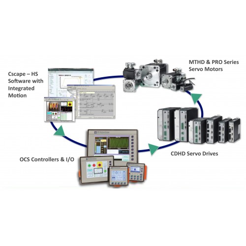 The SmartServo from Horner Automation is a fully developed motion control extension of the OCS All-in-One Controllers. It interconnects with OCS over CANopen (DS30l and DS402 Compliant) built into every OCS Controller. Through this single connection, all configuration, programming, tuning and real-time commands are routed. The drive Configuration is created in Cscape, and stored in the OCS controller.